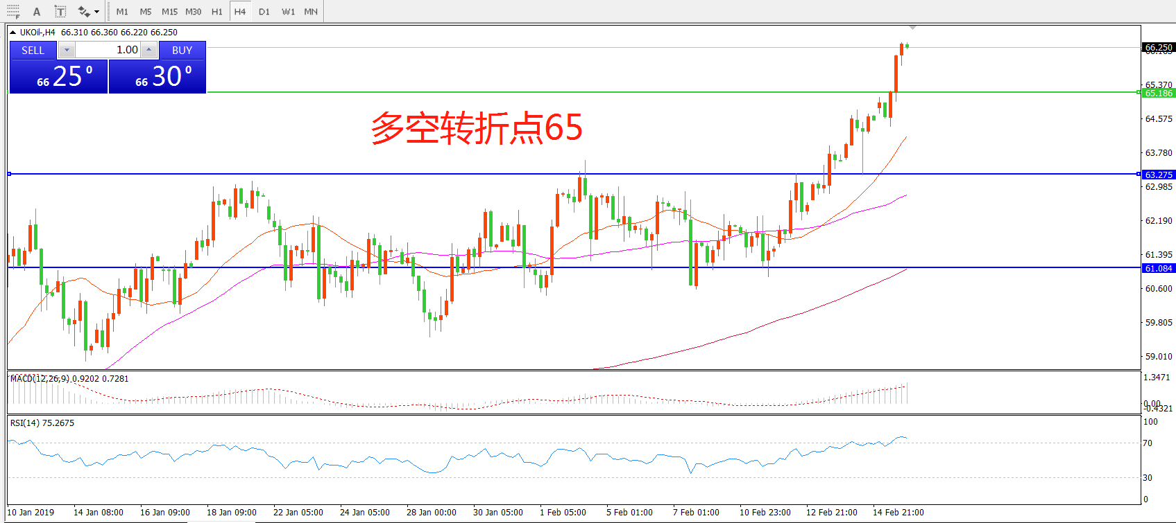 4小时图看,油价突破前期阻力区间后强势上行, 整体形态偏多。均线系统呈多头排列,MACD红柱增加,RSI指标有拐头迹象,小幅回调后,上行概率依然较大。