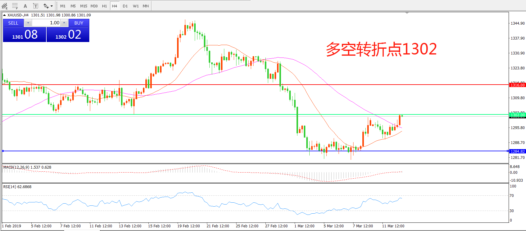 4小时图看,金价近期高连续反弹,并在昨日突破重要关口1300,整体走势十分强势。21周期均线拐头,55周期均线下压,短期内有形成金叉迹象, MACD绿柱缩短,RSI指标向上,目前依然以反弹思路对待。