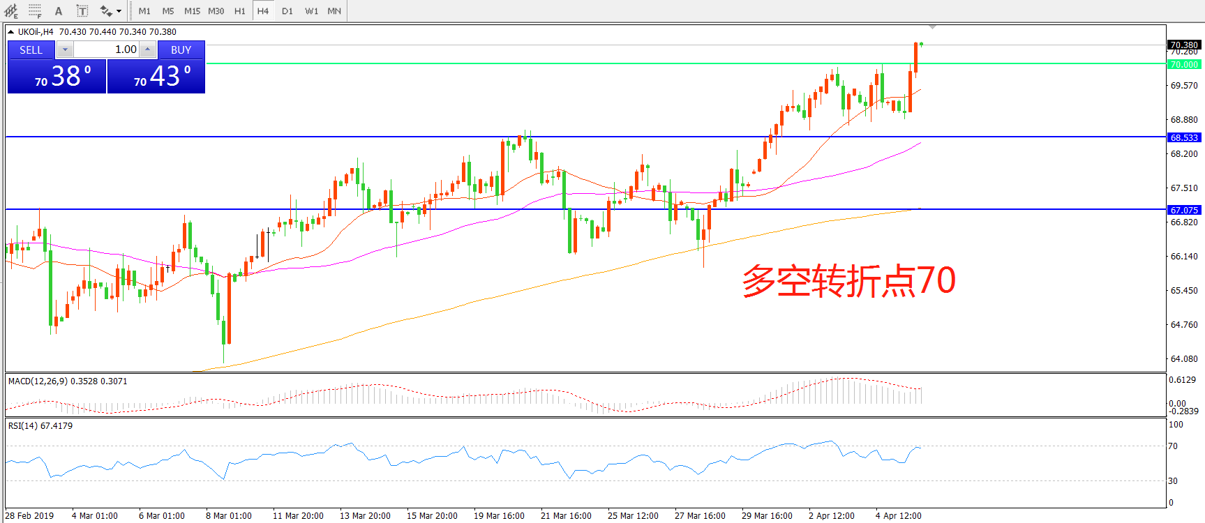美国油服公司贝克休斯周五(4月5日)公布数据显示,截至4月5日当周,美国石油活跃钻井数急升15座至831座,终结六周连降趋势且创去年5月来最大单周增幅。但减产行动以及中美贸易谈判乐观预期带来的提振效果依然显着。布伦特原油盘中最高触及70.48美元/。最终收报70.38美元/桶,本周上涨4.08%。