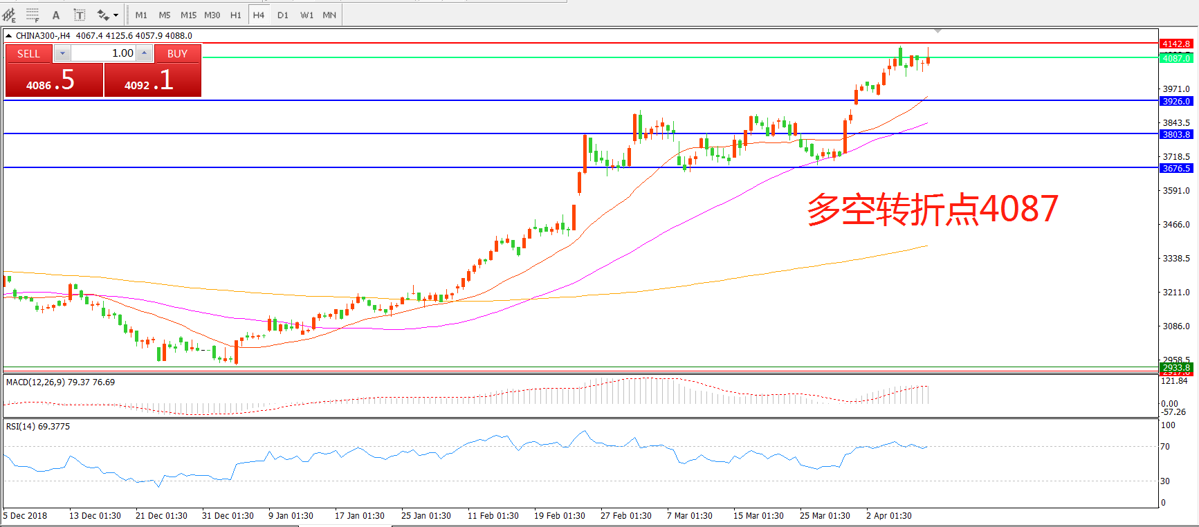 4小时图看,中华指数阳线连续拉升,一度接近4142后出现回落,整体依然偏多,但调整成为可能。 MACD红柱增加,RSI指标拐头,多头趋势依然明显,延续上升概率较大。