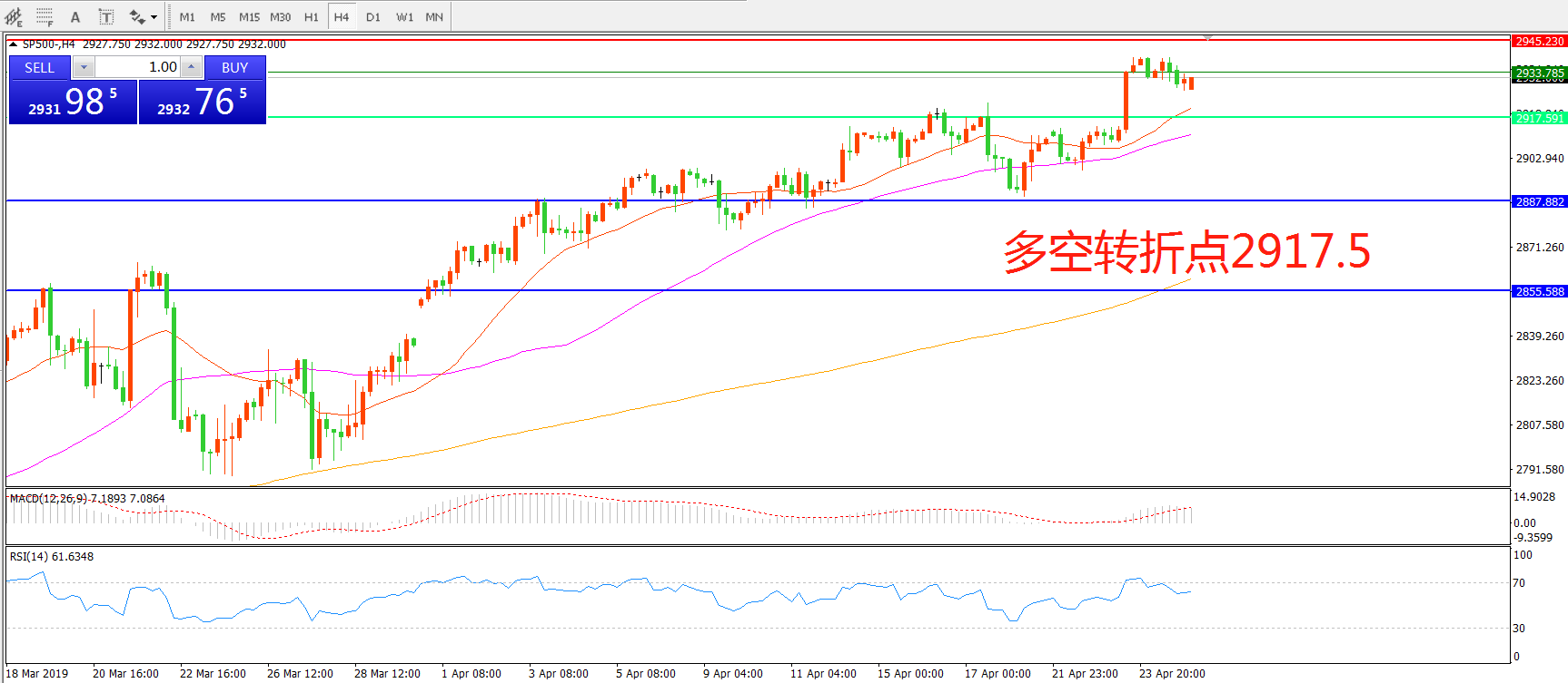 4小时图看,标普500盘冲高后小幅回落,整体走势依然偏强, 均线系统呈多头排列,MACD红柱增加,RSI指标向上,日内预计延续上升概率较大。