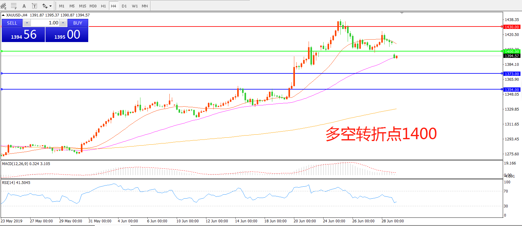 在周末大阪G20会议的中美元首会晤中,美方表示不再对中国出口产品加征新的关税,两国经贸团队将就具体问题进行讨论,中美贸易摩擦的缓和有利于缓解市场担忧情绪。避险情绪的消退导致周一金价开盘大跌13美元,截止发稿前收报1394.00美元/盎司,日内重点关注1400关口得失。