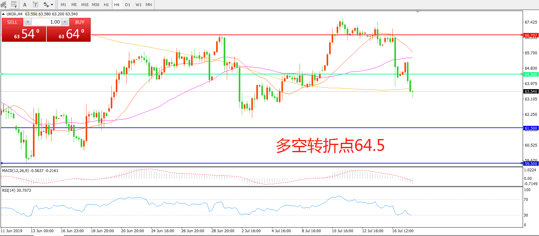 北京时间周三(7月17日)22:30,美国能源信息署公布的数据显示,美国当周除原油库存减少311.6万桶,好于预期,但汽油与精炼油同步出现增长,成品油库存的增加反映了需求端的疲软,为该报告增加了利空基调。美油小幅拉升后掉头大跌,收报63.54美元/桶。
