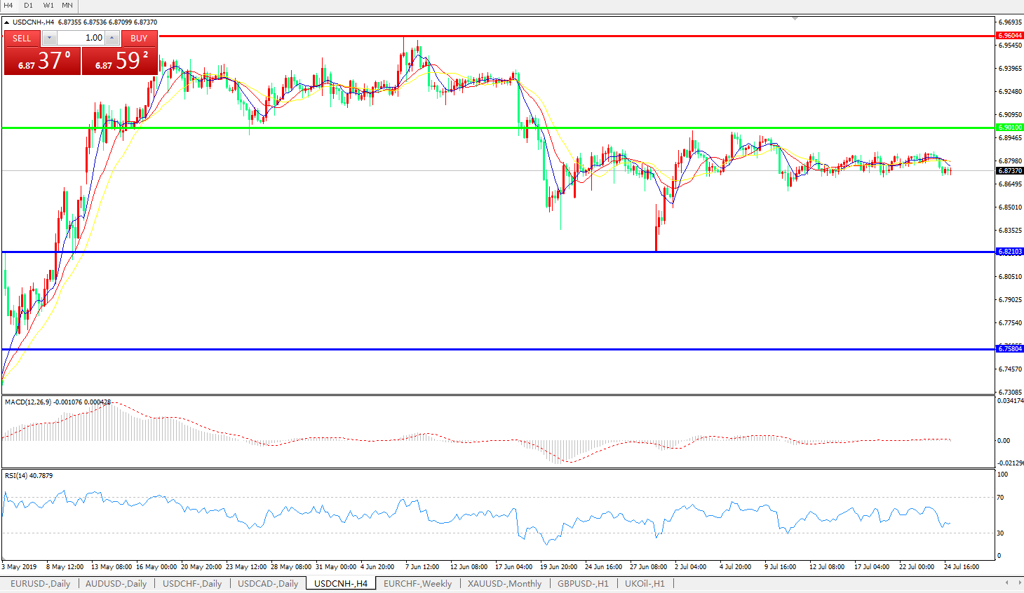 交易策略: 在6.9010之下,看跌,目标价位为6.8210,然后为6.7580。