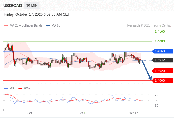 交易策略: 在 1.4060 之下,看跌,目标价位为 1.4020 ,然后为 1.4000 。