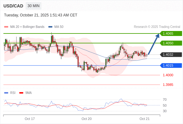 在 1.4015 之上,看涨,目标价位为 1.4050 ,然后为 1.4065 。