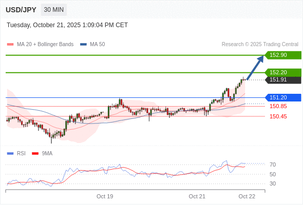 在 151.20 之上,看涨,目标价位为 152.20 ,然后为 152.90 。