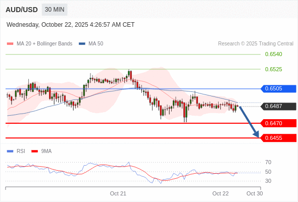 在 0.6505 之下,看跌,目标价位为 0.6470 ,然后为 0.6455 。