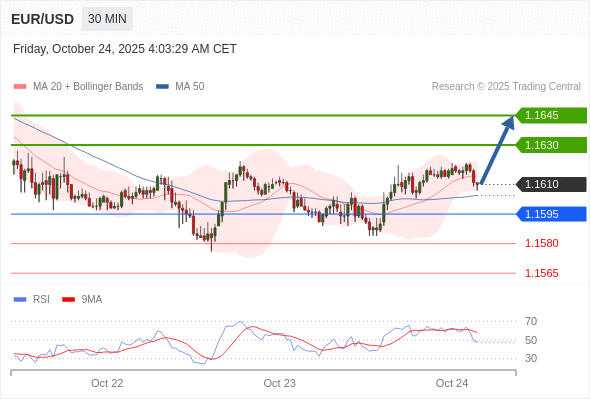 在 1.1595 之上,看涨,目标价位为 1.1630 ,然后为 1.1645 。