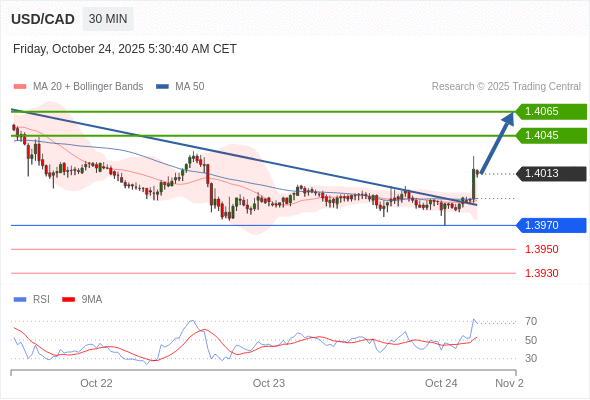 在 1.3970 之上,看涨,目标价位为 1.4045 ,然后为 1.4065 。