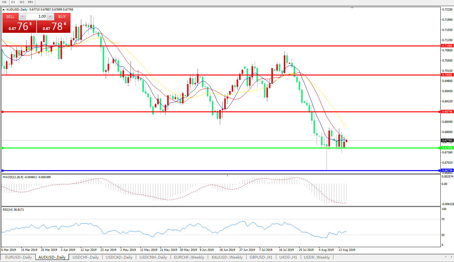 澳元兑美元在周四亚洲时段再现反弹,基本收复了周三的跌势,从日K线度上来看,在行情趋势底部区间进行的剧烈震荡行情还在延续,市场多空交火激烈,突破方向前景难料; 日内推动澳元走强的主要消息是澳洲7月就业数据意外大好,这对冲了来自贸易领域的负面情绪,也令澳洲联储在此后进一步降息的几率下降。与此同时,此前因为美国长短期国债收益率出现倒挂而诱发的市场恐慌避险情绪,在周四也有所缓和;这使得过去一周以来,澳元兑美元都在0.6730-0.6825这一区间内反复震荡,虽然每一天的日内波动看似剧烈,但实际行情趋势却依然不明,这正是行情在夏季交投清淡季节的典型形态,各路投资者也正在期盼此后更多更强力的基本面消息能够给汇市指出明确的方向 。
