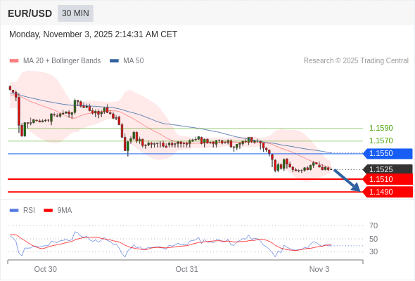 在 1.1550 之下,看跌,目标价位为 1.1510 ,然后为 1.1490 。