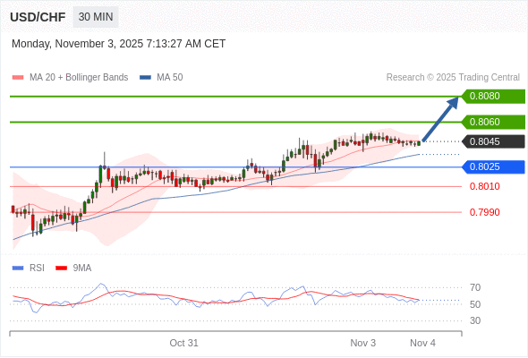 在 0.8025 之上,看涨,目标价位为 0.8060 ,然后为 0.8080 。