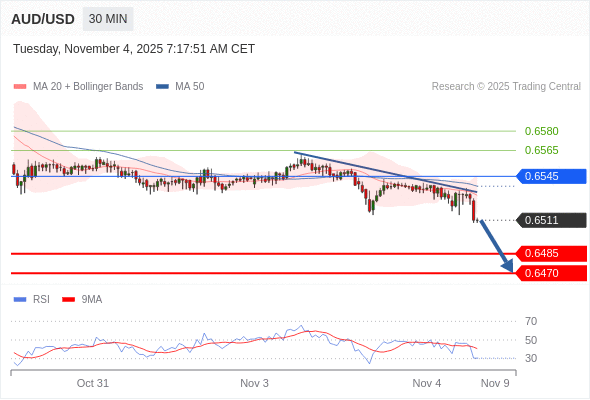 在 0.6545 之下,看跌,目标价位为 0.6485 ,然后为 0.6470 。