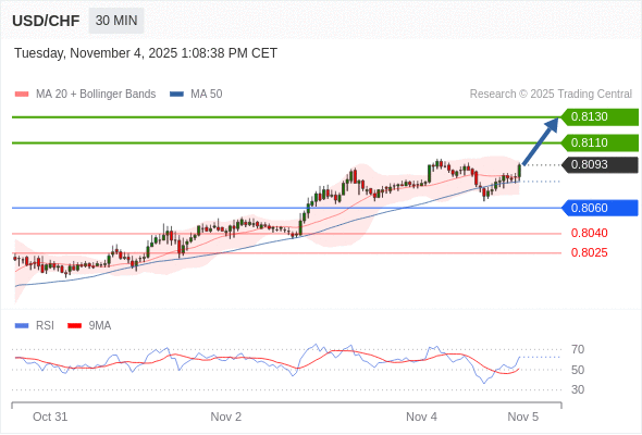 在 0.8060 之上,看涨,目标价位为 0.8110 ,然后为 0.8130 。