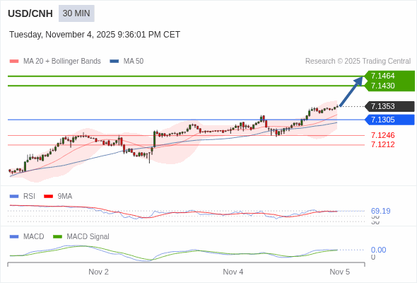 美元/人民币 当日内 : 看涨,当 7.1305 为支撑位。