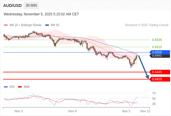 在 0.6500 之下,看跌,目标价位为 0.6445 ,然后为 0.6425 。