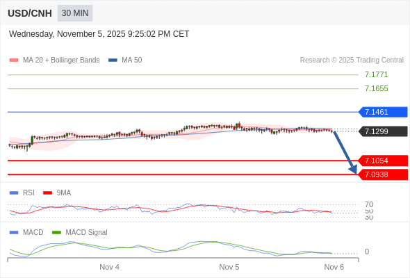 备选策略: 如突破 7.1461 ,USD/CNH 目标方向为 7.1655 和 7.1771 。