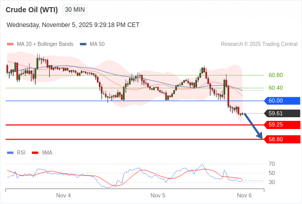 在 60.00 之下,看跌,目标价位为 59.25 ,然后为 58.80 。