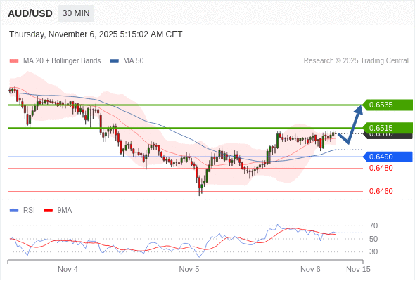 在 0.6490 之上,看涨,目标价位为 0.6515 ,然后为 0.6535 。