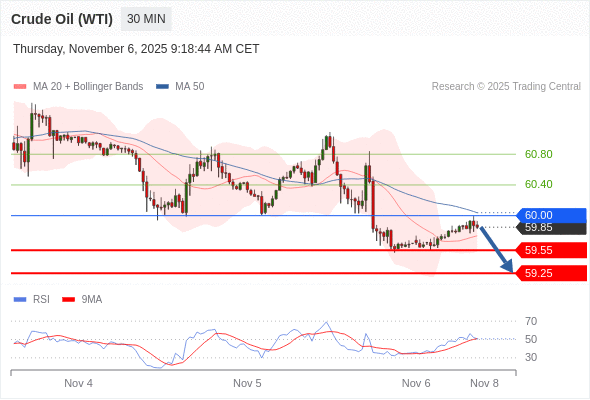 交易策略: 在 60.00 之下,看跌,目标价位为 59.55 ,然后为 59.25 。