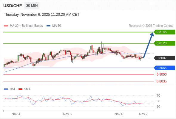 在 0.8065 之上,看涨,目标价位为 0.8120 ,然后为 0.8145 。