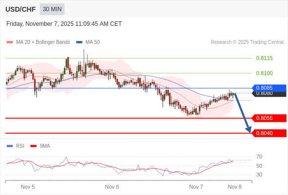在 0.8085 之下,看跌,目标价位为 0.8055 ,然后为 0.8040 。