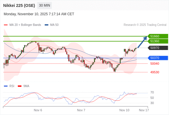 在 50370 之上,看涨,目标价位为 51360 ,然后为 51660 。