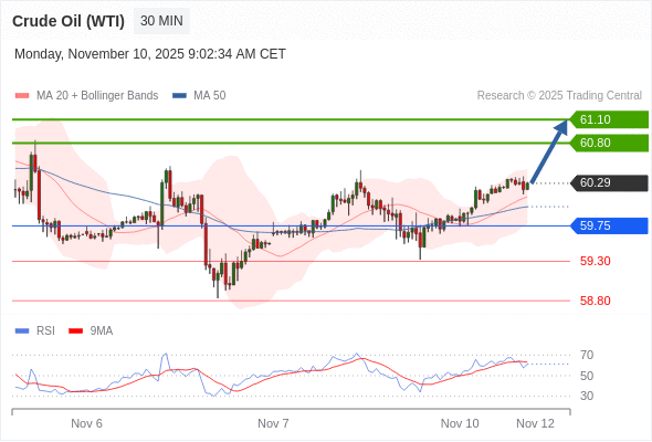 在 59.75 之上,看涨,目标价位为 60.80 ,然后为 61.10 。