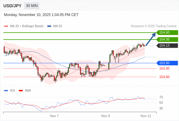 在 153.50 之上,看涨,目标价位为 154.35 ,然后为 154.60 。