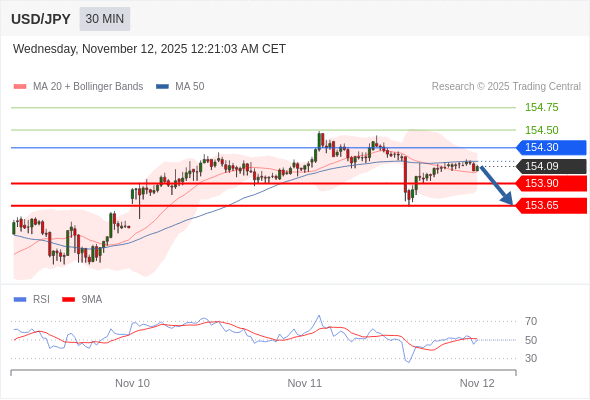 在 154.30 之下,看跌,目标价位为 153.90 ,然后为 153.65 。