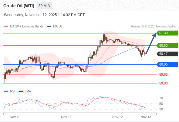在 60.05 之上,看涨,目标价位为 60.80 ,然后为 61.30 。