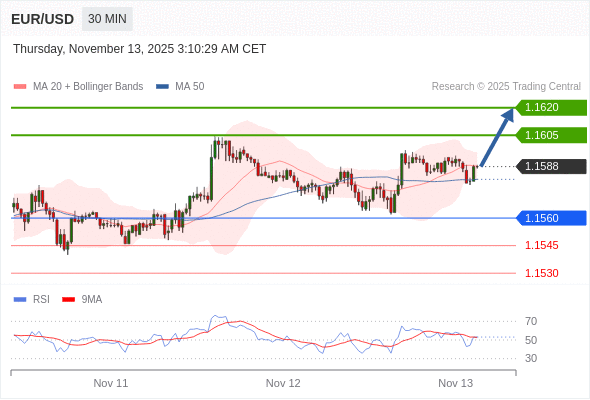 在 1.1560 之上,看涨,目标价位为 1.1605 ,然后为 1.1620 。