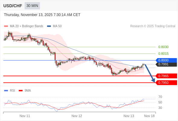在 0.8000 之下,看跌,目标价位为 0.7965 ,然后为 0.7950 。