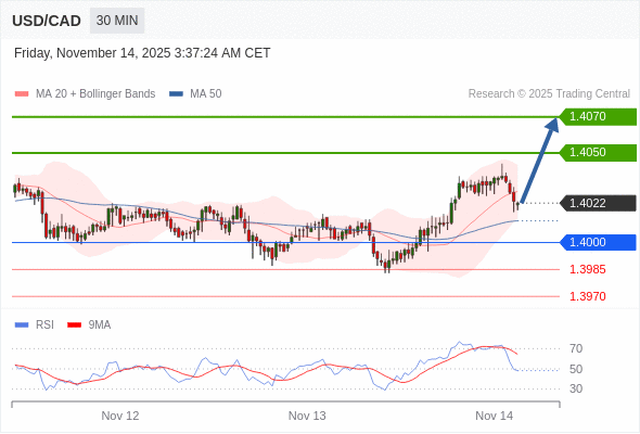 在 1.4000 之上,看涨,目标价位为 1.4050 ,然后为 1.4070 。