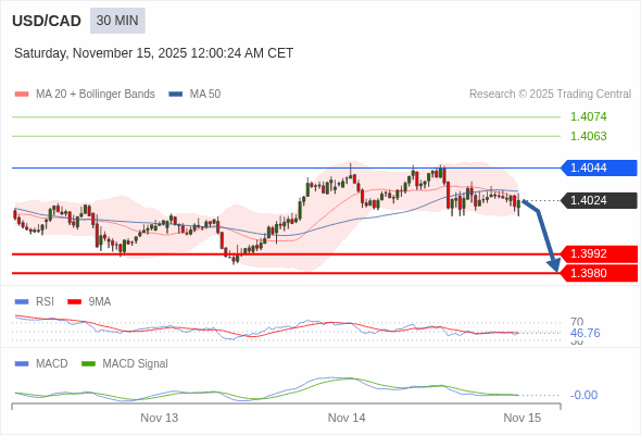 美元/加元 当日内 : 看跌,在 1.4044 之下。