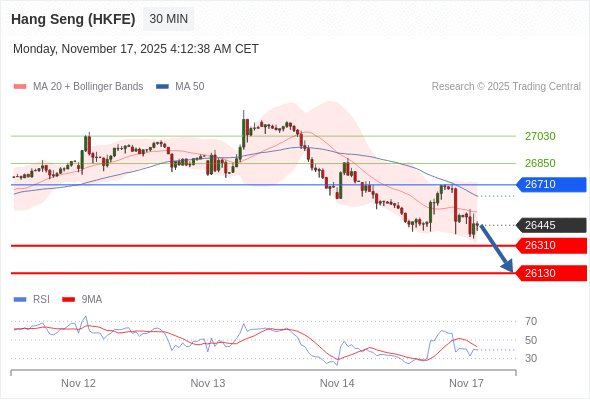 香港恒生指数期货 当日内: 下跌趋势。