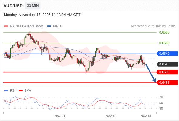 在 0.6540 之下,看跌,目标价位为 0.6505 ,然后为 0.6485 。