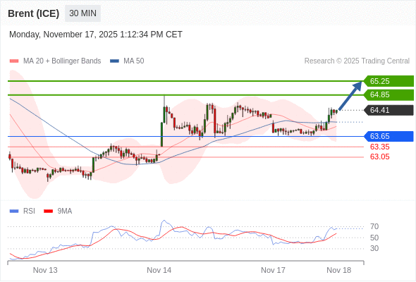 在 63.65 之上,看涨,目标价位为 64.85 ,然后为 65.25 。
