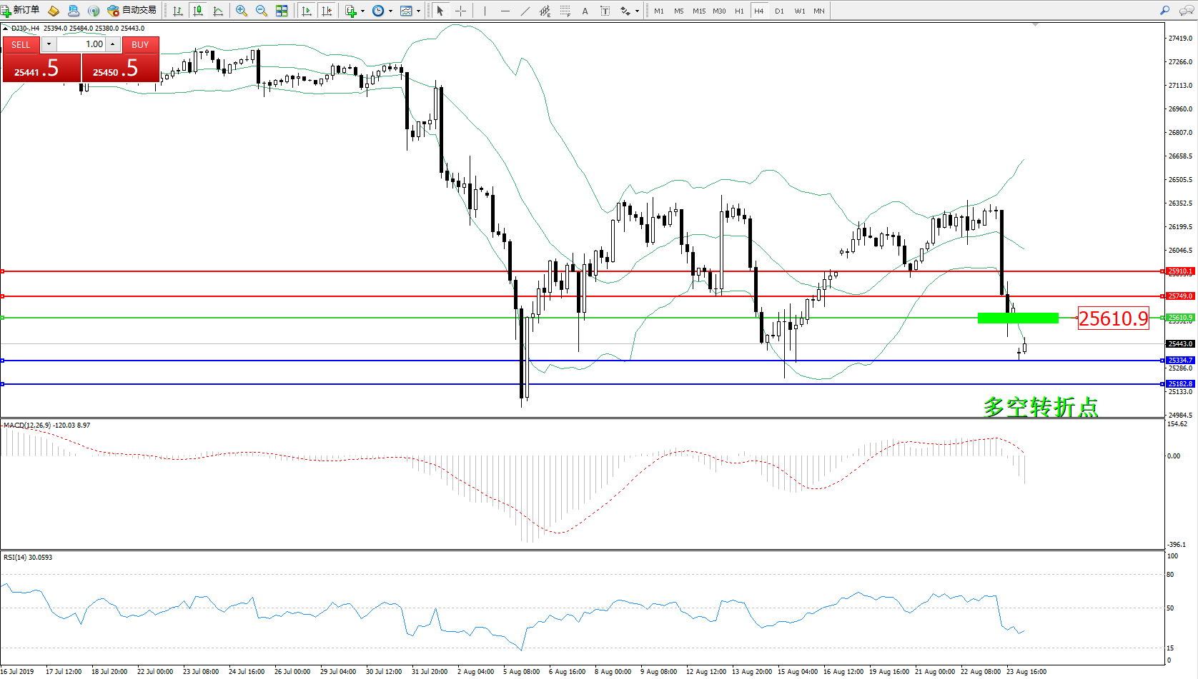 道琼斯指数8月23日(周五)收盘下跌623.30点,跌幅2.37%,报25628.90点。市场仍在关注重新趋紧的全球贸易关系及美联储主席鲍威尔的讲话。鲍威尔称美国经济面临重大风险,将采取适当行动维持美国经济增长。市场认为鲍威尔保持宽松政策的大门敞开。中国宣布对美国的关税政策采取反制措施,对近750亿美元美国商品加征关税。特朗普连发12条推特。要求美国企业尽快停止在中国进行采购。不过,美国商会似乎并不理会总统的“推特圣旨”。