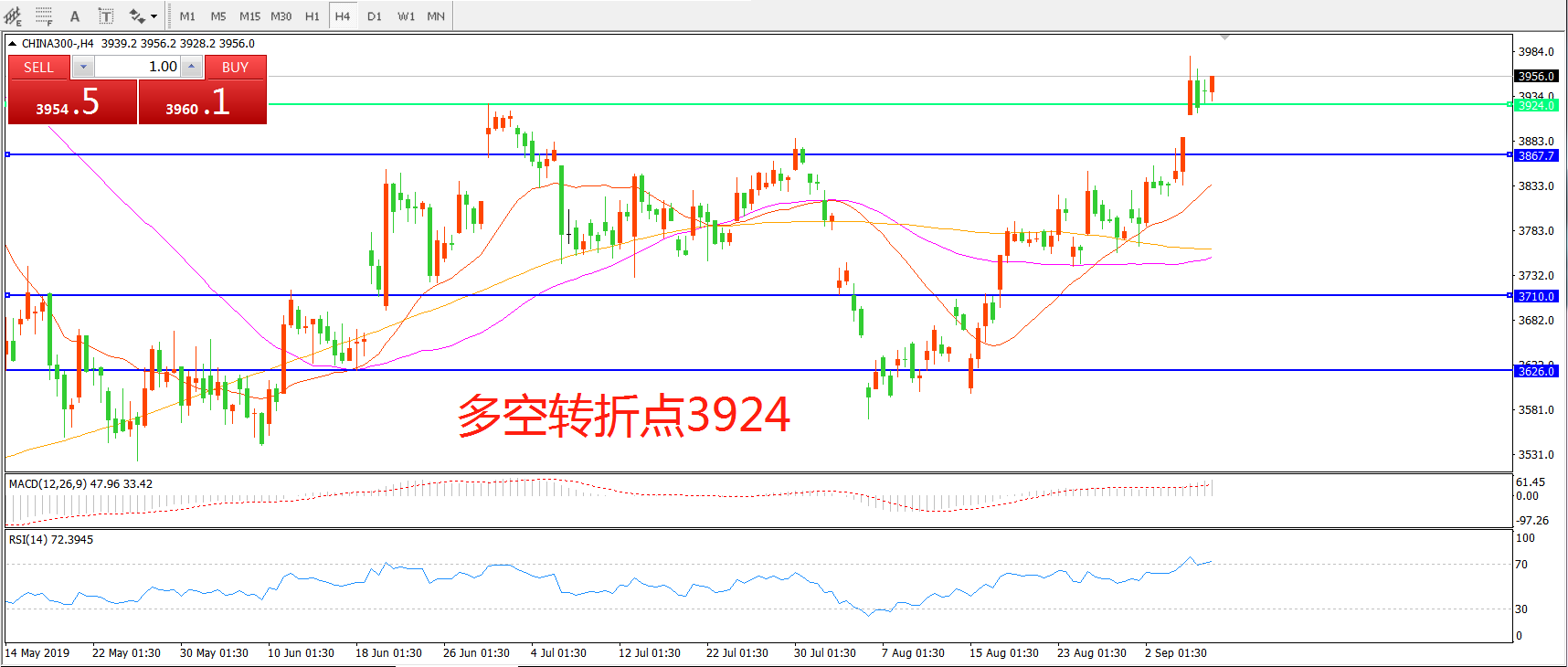 4小时图看,沪深300高开高走,整体走势偏强,均线系统呈多头排列,MACD红柱增加,RSI指标走平,日内延续上行概率较大。