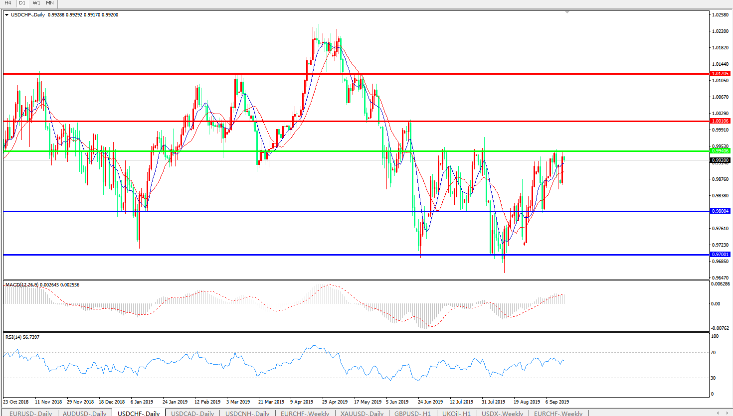 美元兑瑞郎在周一日内逐波走高,北美时段开盘前触及0.9920的日高,基本收复了此前因为美元指数在上周五承压而录得的跌幅。虽然周末中东地缘局势再度恶化引发避险情绪升温,但是周一日内欧系货币欧元和英镑承压下跌对瑞郎的连带影响,却盖过了避险买需的拉动。通常而言,出于地缘因素,中东地区的乱局对于欧洲市场的信心打击要高于北美,这直接引发了市场资金的跨大西洋转移。就算是避险货币瑞郎在此过程中也无法独善其身;此外,在上周欧洲央行出台新宽松行动之后,投资者也开始押注瑞士央行本周会议上势必跟随采取行动,这也遏制了瑞郎的上行空间。眼下,美元兑瑞郎将面临关键200日均线切入位0.9950阻力位,能够升破仍需观望此后美联储决议引发的市场联动状况