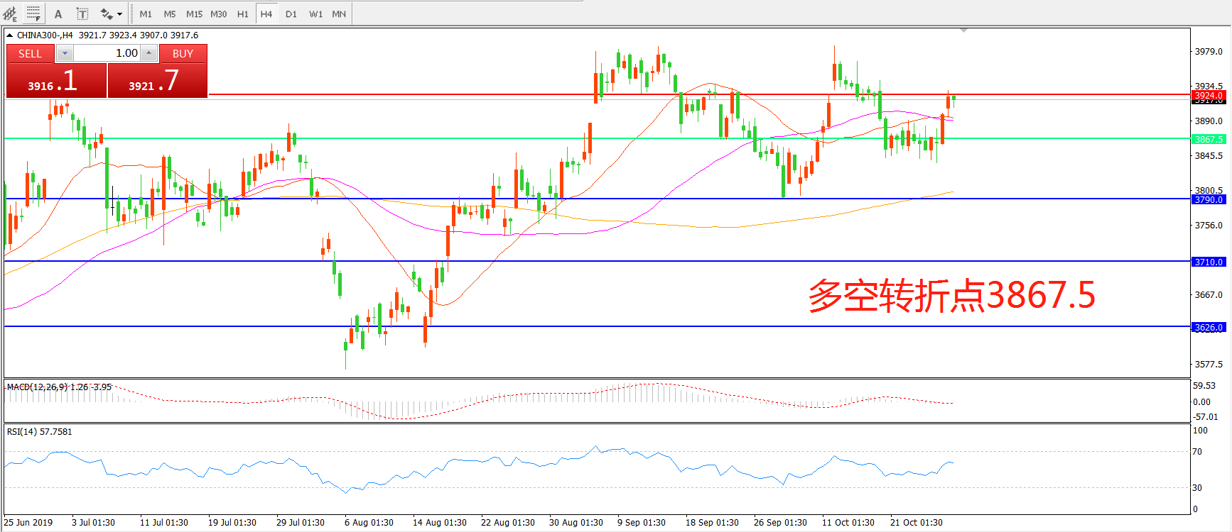 4小时图看,沪深300震荡后强势拉升,整体走势偏强,3924成为短期多空分水岭,均线系统走平,MACD红柱缩短,RSI指标向平,重点关注3924一线得失。