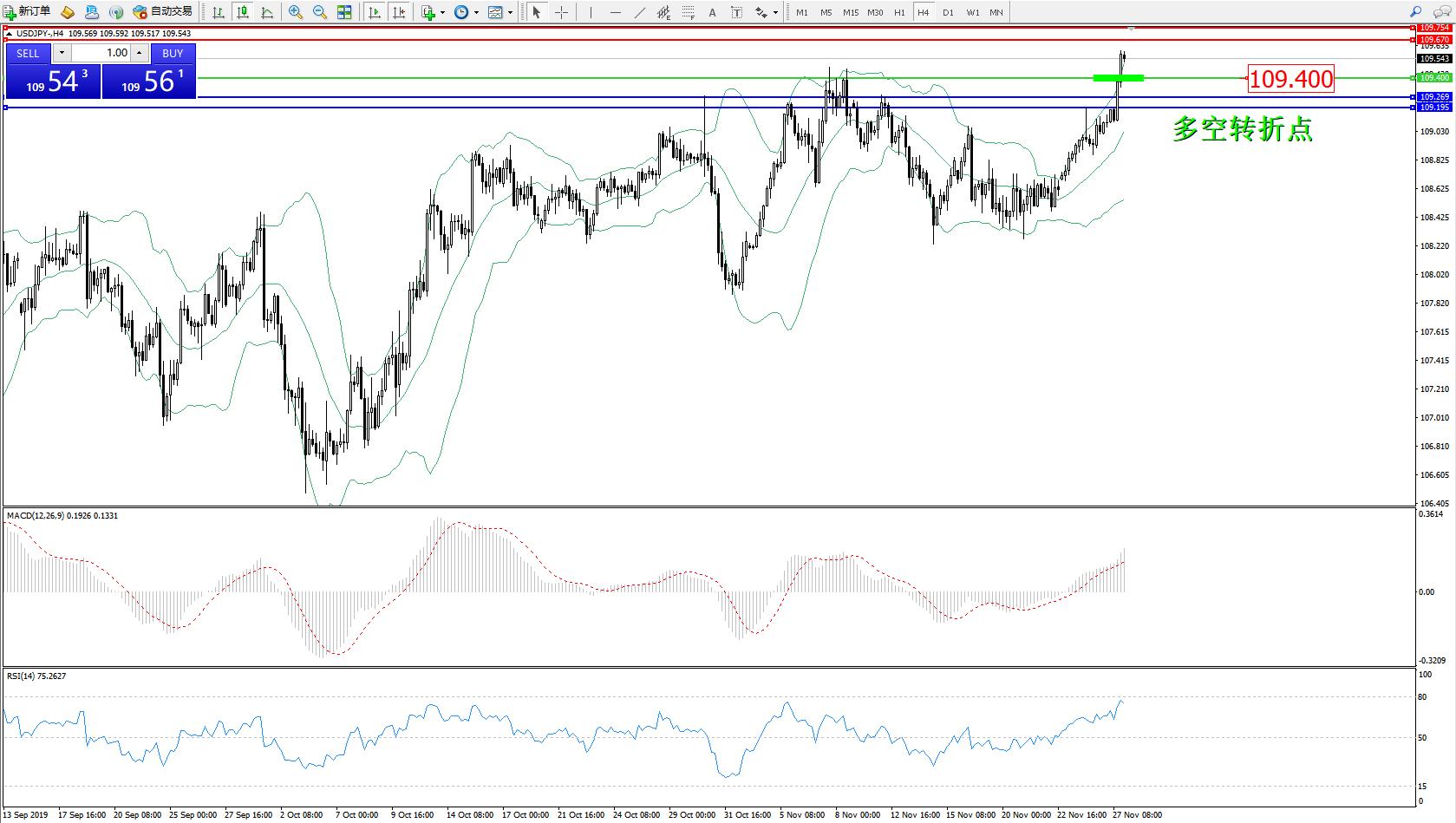 美元兑日元料六连涨,创逾两周新高至109.54,美元指数创近两周新高,因美国多项经济数据整体好于预期有迹象表明贸易乐观,全球股市整体也有所走高,感恩节假期来临,大多数主要货币交投清淡。由于对避险资产的需求减弱,避险日元承压。