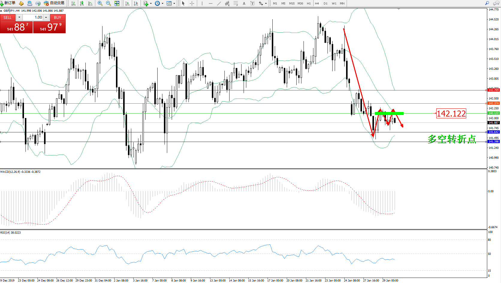 交易策略:142.122下方看跌,目标141.642、141.398