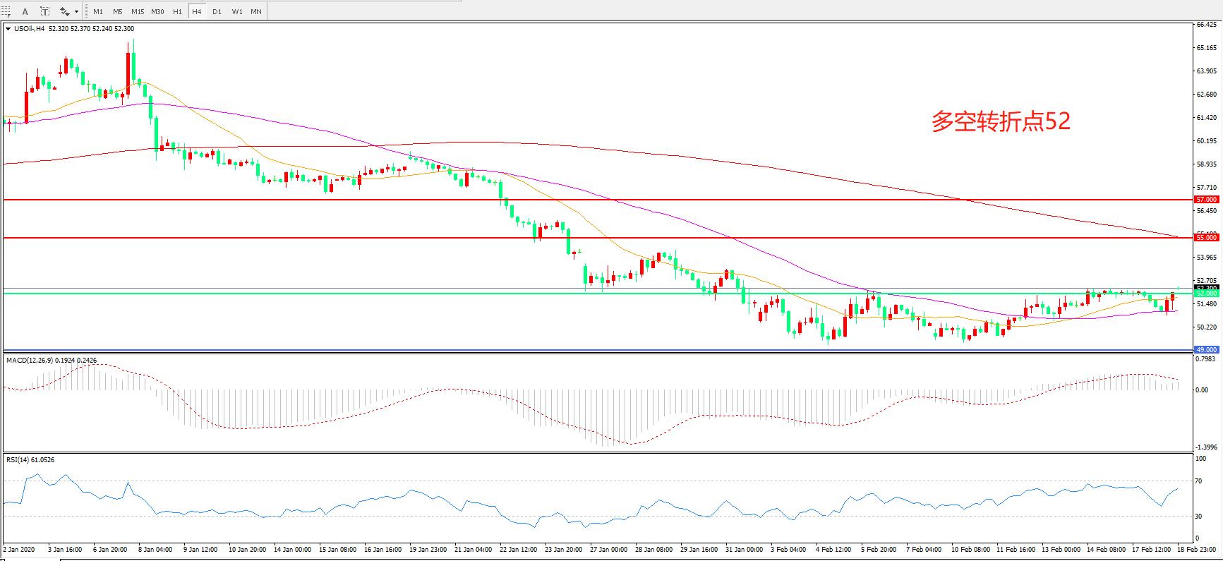 4小时图看,美油维持窄幅震荡,52美元成为短期支撑,整体走势有企稳迹象,短期均线走平,MACD红柱增加,RSI指标走平,日内维持震荡概率较大。