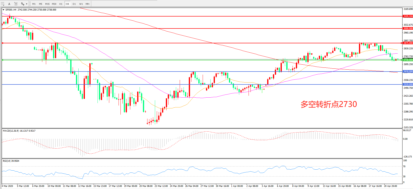 4小时图看,标普震荡下行,整体表现低迷,均线系统走平,2730成为短期多空分水岭,MACD绿柱增加,RSI指标走平,日内震荡上行概率较大。