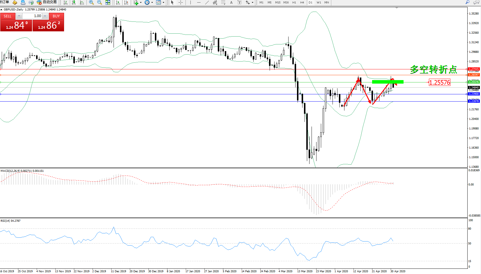 交易策略:1.25576下方看跌,目标1.23900、1.22878
