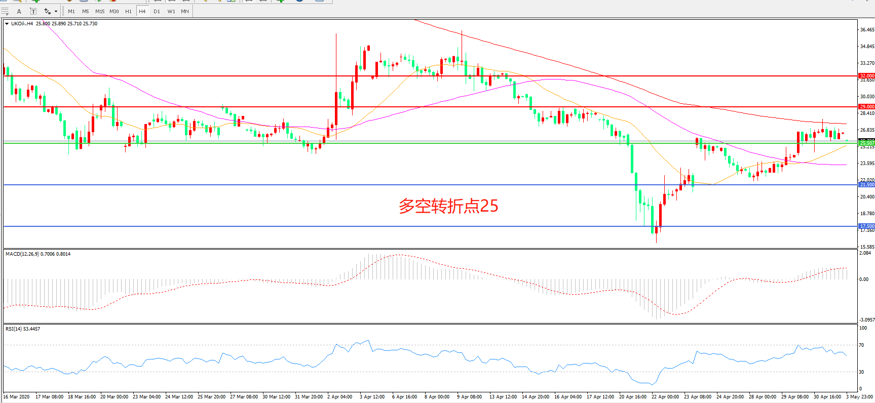 4小时图看,油价震荡反弹,整体表现有所回暖,均线系统走平, MACD红柱增加,RSI指标走平,如能突破27.5美元,延续上行概率较大。