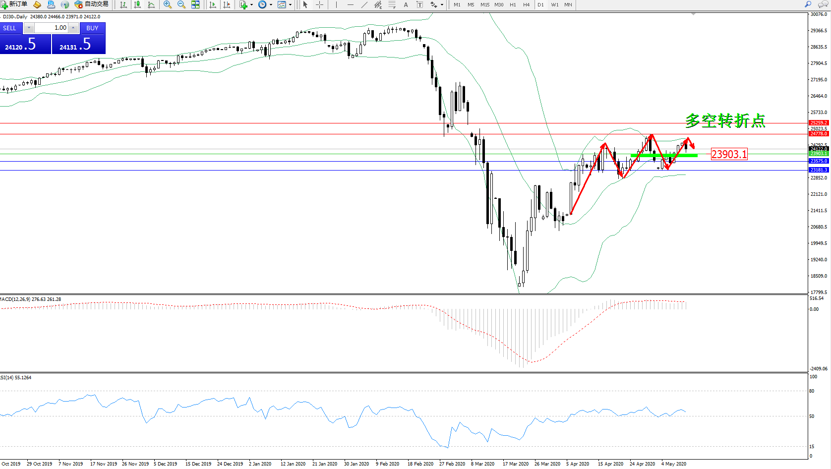 道琼斯指数5月11日(周一)收盘下跌109.30点,跌幅0.45%,报24221.99点。投资者担忧二次疫情的爆发风险,在告别了上周的非农后,本周市场将关注美国通胀数据和零售数据。期货市场定价美国负利率可能性是市场对冲的必然结果。押注美联储利率走势的联邦基金利率期货上周发出信号,预测美联储最早在11月将利率降至零下。由于各国央行和政府采取了前所未有的货币和财政刺激措施,以及各国在经历了长时间的封锁后开始努力恢复经济,股市近期出现反弹。当前的市场行动标志着一种宽慰性的反弹,而不是V型复苏的开始。就收益和国内生产总值(GDP)的前景而言,市场过于乐观。当前疫情引发的供应面冲击或将演变为需求面冲击,从而导致一场更为传统的衰退。